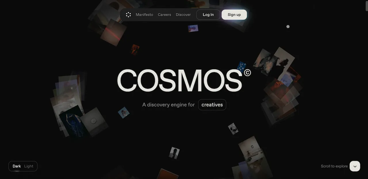 Why we love this landing page: Cosmos immediately communicates its value as a discovery engine for creatives with an engaging, scroll-to-explore interface. The landing page feels dynamic and immersive, using floating visual cards to hint at the diversity of content available, while the minimal design keeps focus on exploration. Every element encourages curiosity and interaction without overwhelming the user.