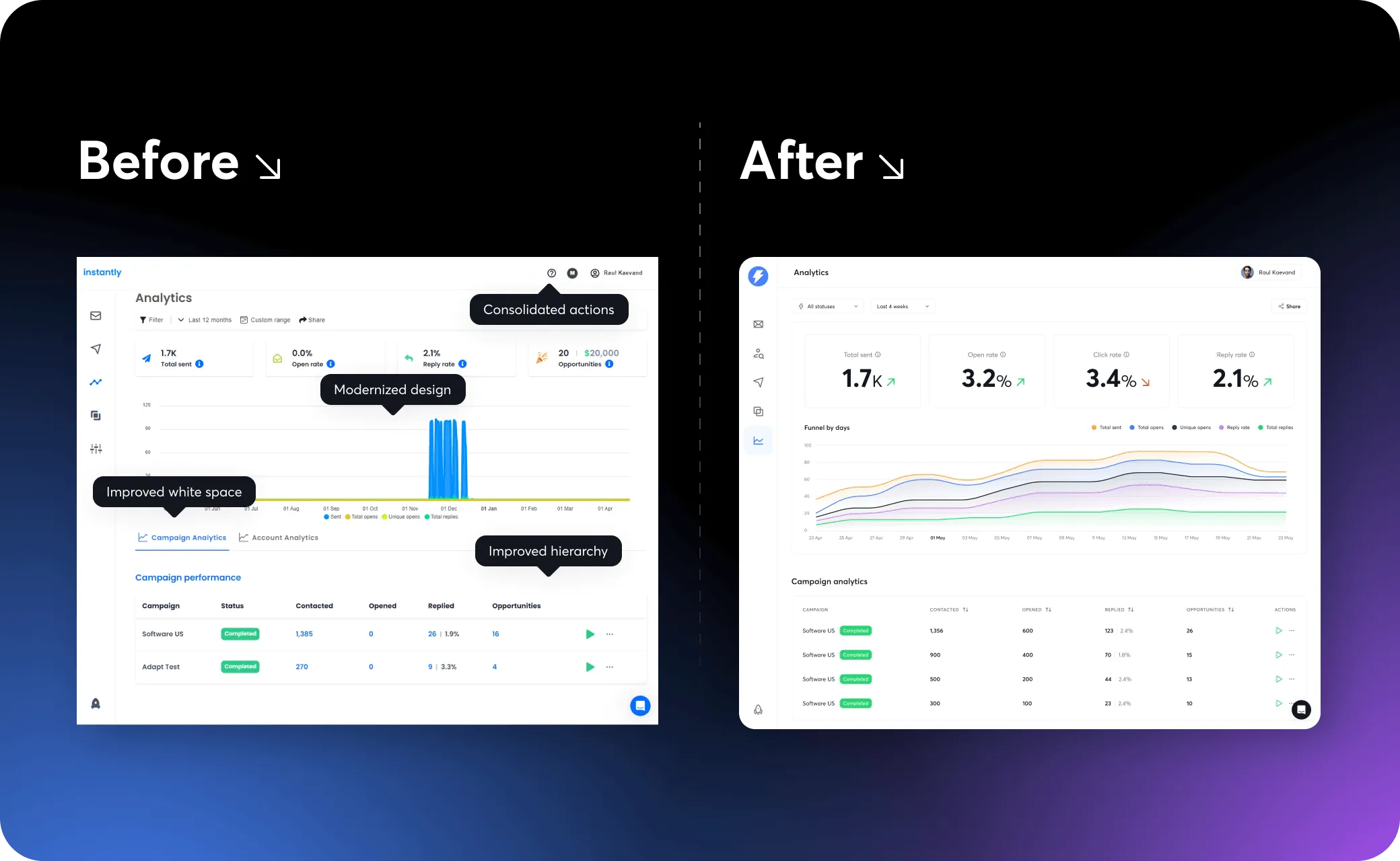 The redesign of the Instantly platform posed challenges, from confusing hierarchy and inconsistent branding to a lack of navigation clarity. The existing system lacked structure, making it tough for users to prioritize actions. Adapting the lead inbox into a mobile app was a key hurdle, requiring a blend of user-centric design and tech innovation for a seamless, on-the-go lead status check.