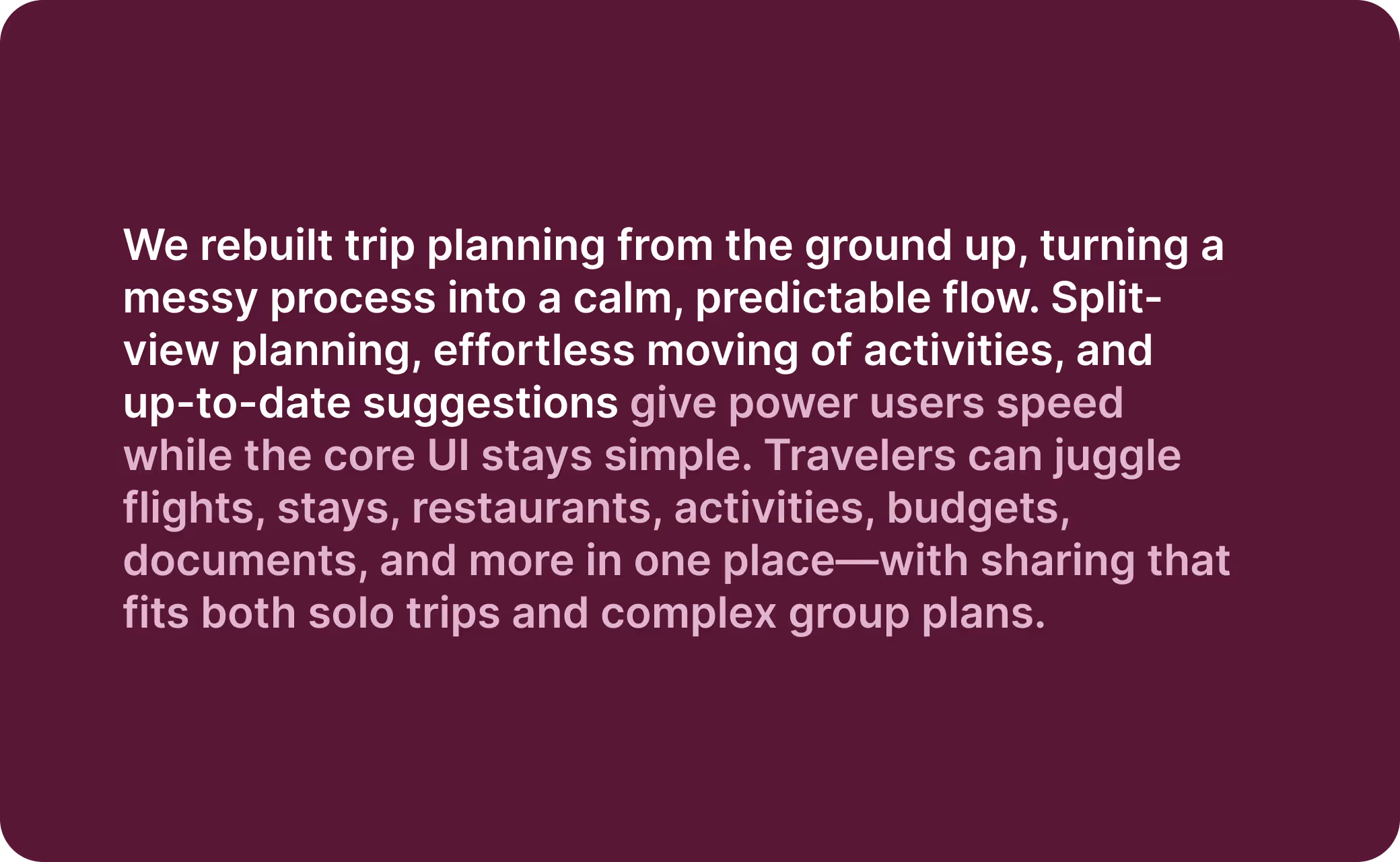 In just six weeks, we have transformed family trip planning with intuitive itinerary building for geographical coherence. We designed a platform that delivers personalized recommendations aligned with each family's needs, considering geographical feasibility. This comprehensive approach empowers families to make informed decisions, craft coherent itineraries, and enjoy seamless travel experiences. With Travelwise, uncertainty is replaced with confidence, making trip planning joyful and sensible.